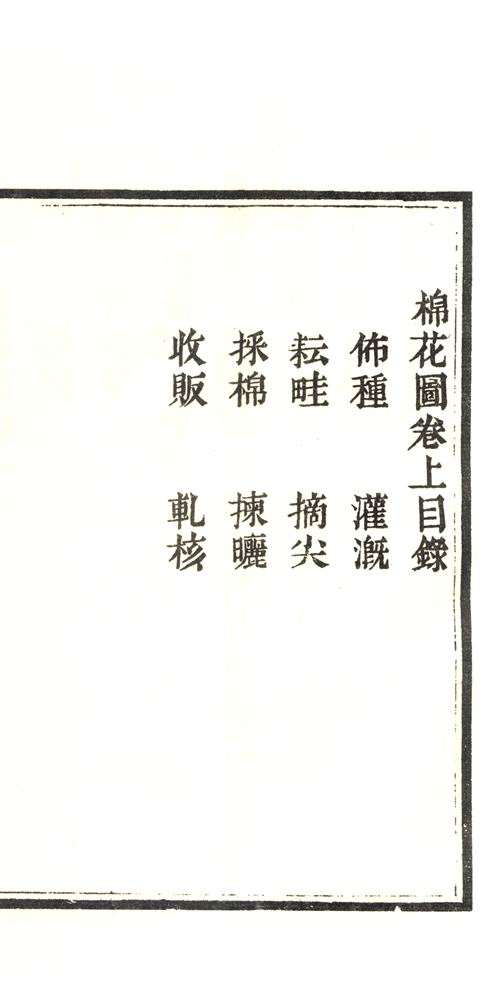 《授衣广训》二卷,又称《棉花图》,是记载清代前期冀中一带棉花种植业及棉纺织手工业情况的一部专着,也是研究我国植棉史、棉纺织业史及清前期社会经济形态的重要资料。 乾隆三十年(一七六五),直隶总督方观承,主持绘制了我国北方地区从棉花种植到染织成布全过程的图录,并附有文字说明。乾隆帝看到後在每幅图上题诗一首,连同康熙帝的《木棉赋》一起制成了《御制棉花图》。後来方观承将《御制棉花图》用石头雕刻,其搨片流传甚广;嘉庆十三年(一八〇八),大学士董诰奉命重新编辑《棉花图》,内容除原赋、原诗、原图及说明外,还包括嘉庆帝和诗、嘉庆帝谕旨、董诰奏表、方观承原奏等内容,更名为《授衣广训》,由肉府木刻雕版刊行。