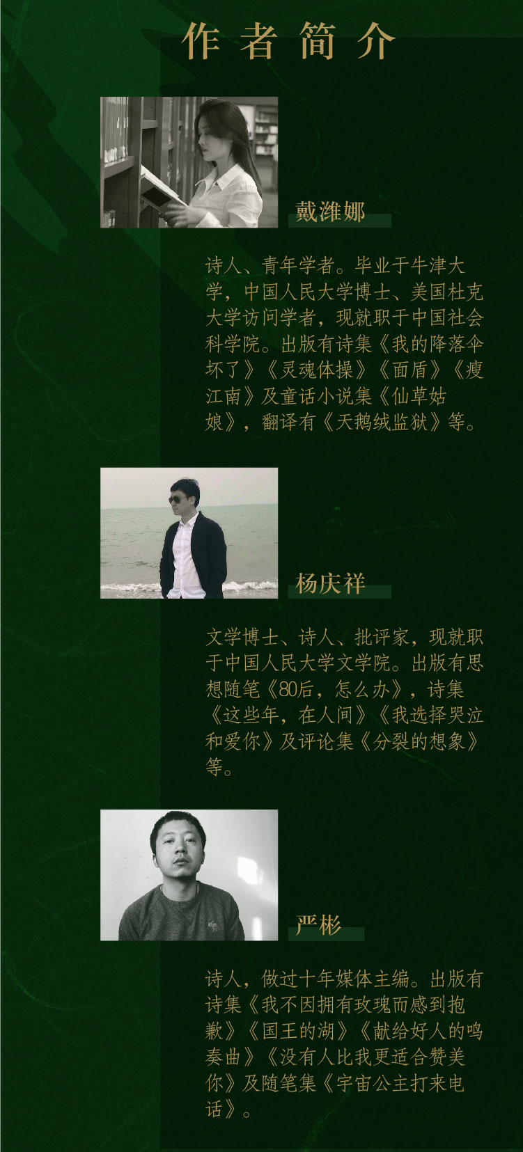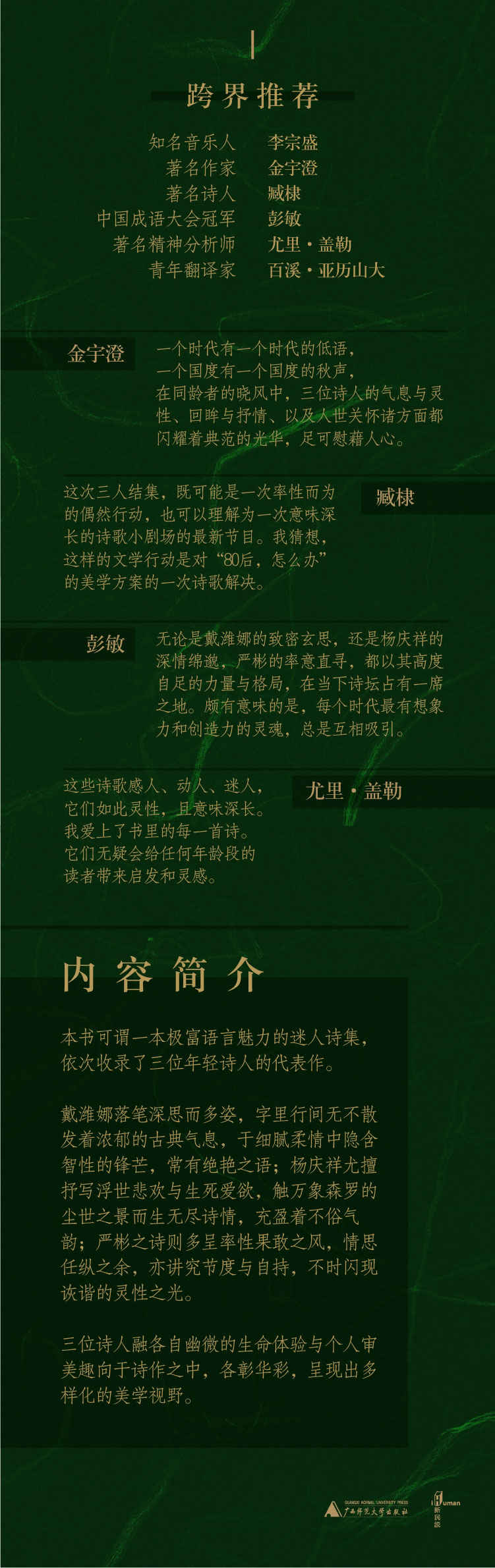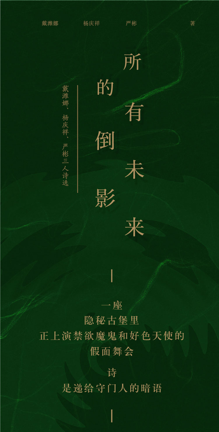 本书可谓一本极富语言魅力的迷人诗集,依次收录了三位年轻诗人的代表作。个中所涉题材甚为丰富,既有对生命的澄思静观、对人性的观照剖析、对往昔的感怀追思等颇具人文情怀的絮絮私语,亦不乏关于文学、关于创作等层面上的种种探思。戴潍娜落笔深思而多姿,字里行间无不散发着浓郁的古典气息,于细腻柔情中隐含智性的锋芒,常有绝艳之语;杨庆祥尤擅抒写浮世悲欢与生死爱欲,触万象森罗的尘世之景而生无尽诗情,充盈着不俗气韵;严彬之诗则多呈率性果敢之风,情思任纵之余,亦讲究节度与自持,不时闪现诙谐的灵性之光。三位诗人融各自幽微的生命体验与个人审美趣向于诗作之中,各彰华彩,呈现出多样化的美学视野。