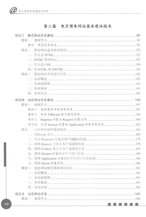 《电子商务网站建设与维护/实战型电子商务系列“十二五”规划教材》分三篇,共七个项目。 第一篇电子商务网站建设基础知识(项目一、项目二),内容包括电子商务网站的基本概念、电子商务网站建设的工具、网站的规划与设计、网站服务器方案的选择及建站流程等。 第二篇电子商务网站基本建站技术(项目三至项目六),内容包括静态网站制作、动态网站开发及电子商务网站综合开发等多个项目,每个项目均由多个案例组成。 第三篇电子商务网站后期维护(项目七),内容包括电了商务网站的安全、运营与维护。本过程和方法。