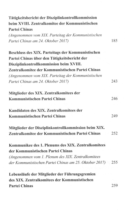 《中国共产党第十九次全国代表大会文献(德文)》收录同志代表第十八届中央委员会向大会作的报告、关于十八届中央委员会报告的决议、中国共产党章程、关于《中国共产党章程(修正案)》的决议、十八届中央纪律检查委员会工作报告、关于十八届中央纪律检查委员会工作报告的决议、第十九届中央委员会委员名单、第十九届中央委员会候补委员名单、第十九届中央纪律检查委员会委员名单、第十九届中央委员会靠前次全体会议公报以及十九届中央领导机构成员简历等内容。
