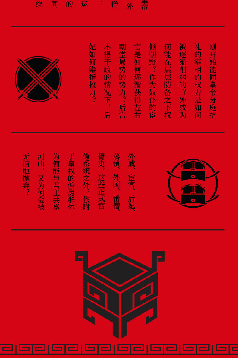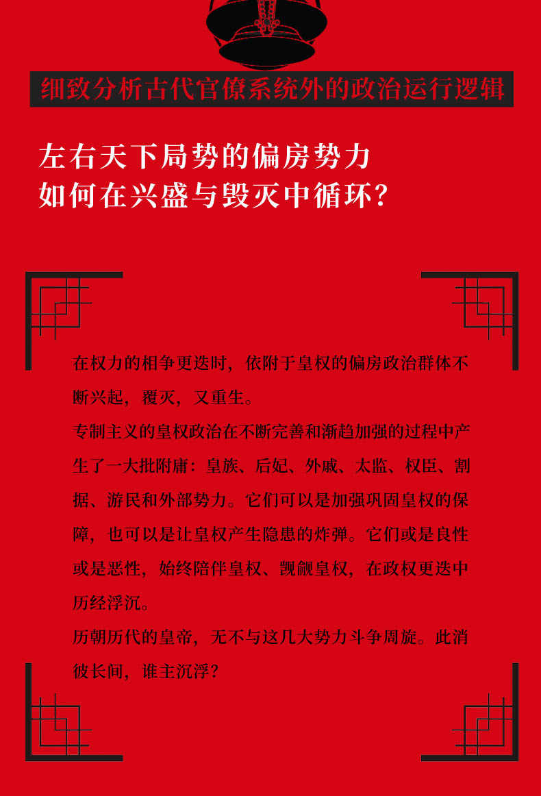 在权力的相争更迭时,依附于皇权的偏房政治群体不断兴起,覆灭,又重生。专制主义的皇权政治在不断完善和渐趋加强的过程中产生了一大批附庸:皇族、后妃、外戚、太监、权臣、割据、游民和外部势力。它们可以是加强巩固皇权的保障,也可以是让皇权产生隐患的炸弹。它们或是良性或是恶性,始终陪伴皇权、觊觎皇权,在政权更迭中历经浮沉。