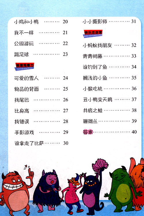 本套丛书按照3?6岁孩子的智力发育和认知规律,采用由易到难循序渐进的科学编排方式,内容丰富,题目新颖,配有大量精美图片,让孩子在享受快乐游戏的同时,激发大脑的无限潜能。