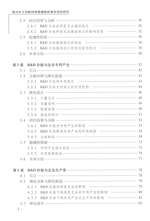 党的十八大提出的创新驱动发展战略与技术创新驱动的内生经济增长理论高度吻合。技术创新源于R&D投资,但R&D的正外溢性、不确定性和融资约束等导致的R&D市场失灵需要政府支持。R&D补贴、税收激励是供给面支持手段,政府采购是需求面支持手段。自2006年中国提出自主创新、建设创新型国家以来,政府在R&D财税激励和政府采购上不吝投入。2006-2015年,政府对企业的R&D补贴从96.8亿元上升到419.1亿元,年均增长17.680/0。R&D税收激励尽管没有详尽的税式支出预算,但零星披露的数据显示,近年来我国R&D税收激励的规模也相当可观:2008~2011年,高新技术企业累计享受企业所得税优惠2259亿元,2014年高新技术企业减免税613.1亿元,2015年高新技术企业减征企业所得税1000多亿元。与此同时,政府采购规模也逐年增加,以环保产品为例,2015年达到1360亿元。但慷慨的R&D财税激励的有效性究竟如何一直缺乏深入、系统、科学的研究。研究面向自主创新的财税激励政策有效性进而优化财税激励政策体系,是提高财政科技资金配置效率的基本要求。基于此,《面向自主创新的财税激励政策有效性研究》以2009—2013年中国上市公司微观数据为样本,运用能克服样本自选择性的计量方法(获得R&D补贴和税收激励的样本均具有自选择性),如倾向评分匹配法(PSM)、处理效应模型、CDM模型等,系统研究供给面R&D补贴和税收激励的有效性:R&D补贴、R&D税收激励分别对企业创新投入(研发支出)、创新产出(专利)和创新绩效(全要素生产率)的影响,并提出了改善R&D财税激励政策有效性的改革建议。而对于需求面的政府采购,基于数据的可得性,只能选用省级面板数据来分析其技术创新效应(创新产出),并提出了相应的政策建议。 第2章研究制度环境约束下R&D补贴的研发支出效应及其影响因素。PSM估计表明,R&D补贴对企业的总研发支出和私人研发支出均产生了显著的激励效应,该效应分别占总研发支出和私人研发支出的比重为26.33010和15.85%,R&D补贴对企业研发支出具有挤入效应。分组检验表明,该激励效应还因行业、所有制和地区制度环境而异。对R&D补贴激励效应的回归分析发现,制度环境强化了R&D补贴的激励效应,即制度环境越好的地区,R&D补贴对研发支出产生的激励效应越大。上述结论得到了稳健性检验的支持。同时,为实现“产业政策要准”,宜采取差别化的补贴政策。而提高R&D补贴激励效应的关键,则在于优化地区制度环境。 第3章研究知识产权保护下R&D补贴的创新产出效应及其作用机制。从创新产出来看,与没有接受R&D补贴的厂商相比,平均而言,接受R&D补贴的厂商其专利总量、发明专利更多,但实用新型专利和外观设计专利没有显著差别,R&D补贴的专利产出效应因专利类型而异。R&D补贴对不同类型专利的作用机制不同。R&D补贴引致的研发支出显著增加专利总量,R&D补贴引致的研发支出、反事实研发支出以及二者在知识产权保护的调节下显著增加发明专利,但这些因素对实用新型专利和外观设计专利均没有显著影响。同时,对技术新颖度高的发明专利而言,R&D补贴的激励效应主要是通过反事实研发支出以及知识产权保护的调节作用来实现的,R&D补贴引致的研发支出以及知识产权保护的调节作用对其贡献非常有限,中国的R&D补贴在将引致研发支出转化为发明专利上呈现出的低效率,与“欧洲悖论”相似。 第4章研究R&D补贴的生产率效应。采用CDM模型的研究发现,R&D补贴能激励企业增加研发支出、专利产出,但由于专利质量不高和科技成果转化率低,并不能激励企业的生产率提升,中国R&D补贴的生产率效应也面临类似的“欧洲悖论”困境。进一步采用一步法(以PSM直接估计R&D补贴的额外生产率效应)和两步法(先以PSM估计R&D补贴的研发支出效应,再以GMM估计后者对企业生产率的影响)的稳健性检验,也得到了相同的结论。因此,从短期来看,中国的R&D补贴对于提升企业生产率乏善可陈。 第5章研究制度环境约束下R&D税收激励的研发支出效应及其影响因素。采用PSM的估计表明,R&D税收激励对企业的研发支出产生了显著的挤入效应,且该挤入效应占企业研发支出的比重为11.39%。分组检验表明,R&D税收激励的挤入效应还因行业、所有制和地区制度环境而异。进一步对影响R&D税收激励挤入效应的回归分析发现,制度环境强化R&D税收激励的挤入效应,即在制度环境越好的地区,R&D税收激励产生的挤入效应越大,制度环境与R&D税收激励之间具有互补性。该发现也通过了采用不同研究方法和关键变量替换的稳健性检验。