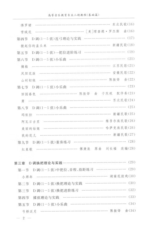 《高等音乐教育专业二胡教程》是一本专为高等音乐教育专业二胡课教学编写的教材。它包括前言、基础篇、中级篇、高级篇四个部分。前言部分介绍了教材编写的目的、适用对象、教学组织形式、评价标准;基础篇分为八章,每章有八节,分别包含了二胡基础知识,理论知识和实践技能掌握的详细说明和要求,自成体系适合零基础的学生学习。中级篇针对有一定二胡演奏基础的学生,它旨在提高学生的理论水平和演奏水平。因此,曲目的选择和教学要求的难易程度非常适合学生进一步学习使用。高级篇是专门为二胡主修学生量身打造的篇章。练习曲、传统乐曲、风格性乐曲和移植乐曲都挑选了目前国内前沿和能体现二胡发展水平和高度的作品。