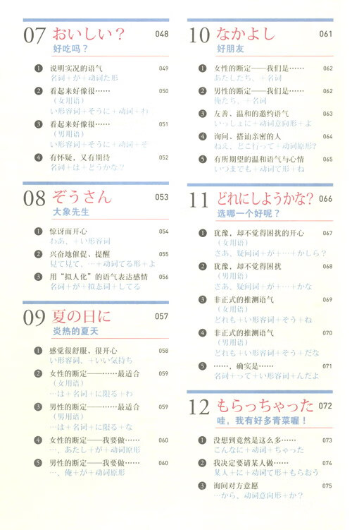 本书是面向初级学习者的日语会话教材, 旨在教授如何使用简单的词句表达丰富的感情内容, 具备50音基础的读者就能自学精通。“字数不多、简单、有感情”是本书的特色。全书共48课, 每篇课文都非常简短。作者力求做到让内容生活化并兼具趣味性。课文的句子中特别加上了顿号, 顿号前后的单词可以替换。读者在阅读时可以试着自己进行替换练习。