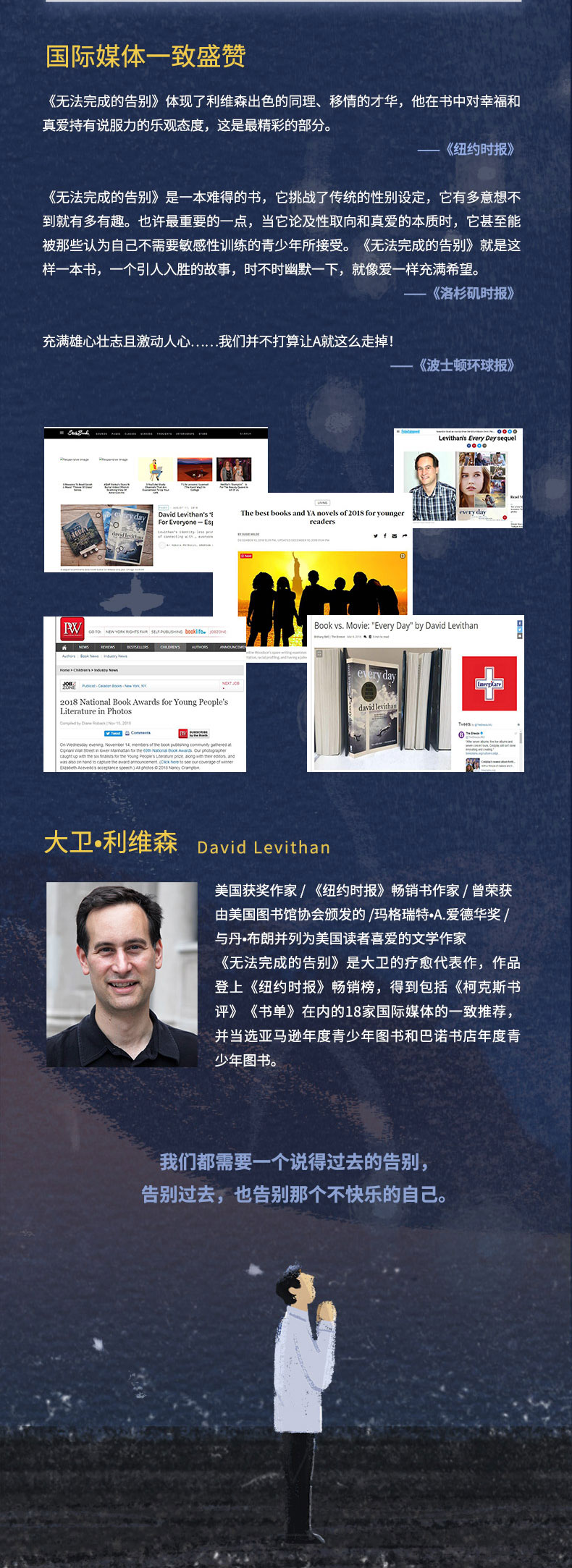 作者: [美]大卫.利维森(David Levithan):美国获奖作家,《纽约时报》畅销书作家,曾荣获由美国图书馆协会颁发的玛格瑞特.A.爱德华奖。《无法完成的告别》是大卫的疗愈代表作,作品登上《纽约时报》畅销榜,得到包括《柯克斯书评》《书单》在内的18家国际媒体的一致推荐,并当选巴诺书店年度青少年图书。 译者:李亚飞,自由译者,深研比较文学,于中西方文学差异中求其相同之处,曾译作品《老人与海》等。